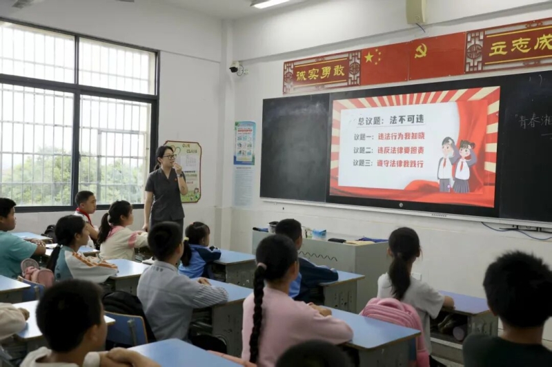 “遵守法律我践行”互动环节点燃了同学们的参与热情。大家认真写下自己的法治践行计划,“要多看法治教育片,了解更多法律知识”“不闯红灯、不破坏公物,从小事做起遵守法律”“如果被欺负,会第一时间告诉老师和家长”。