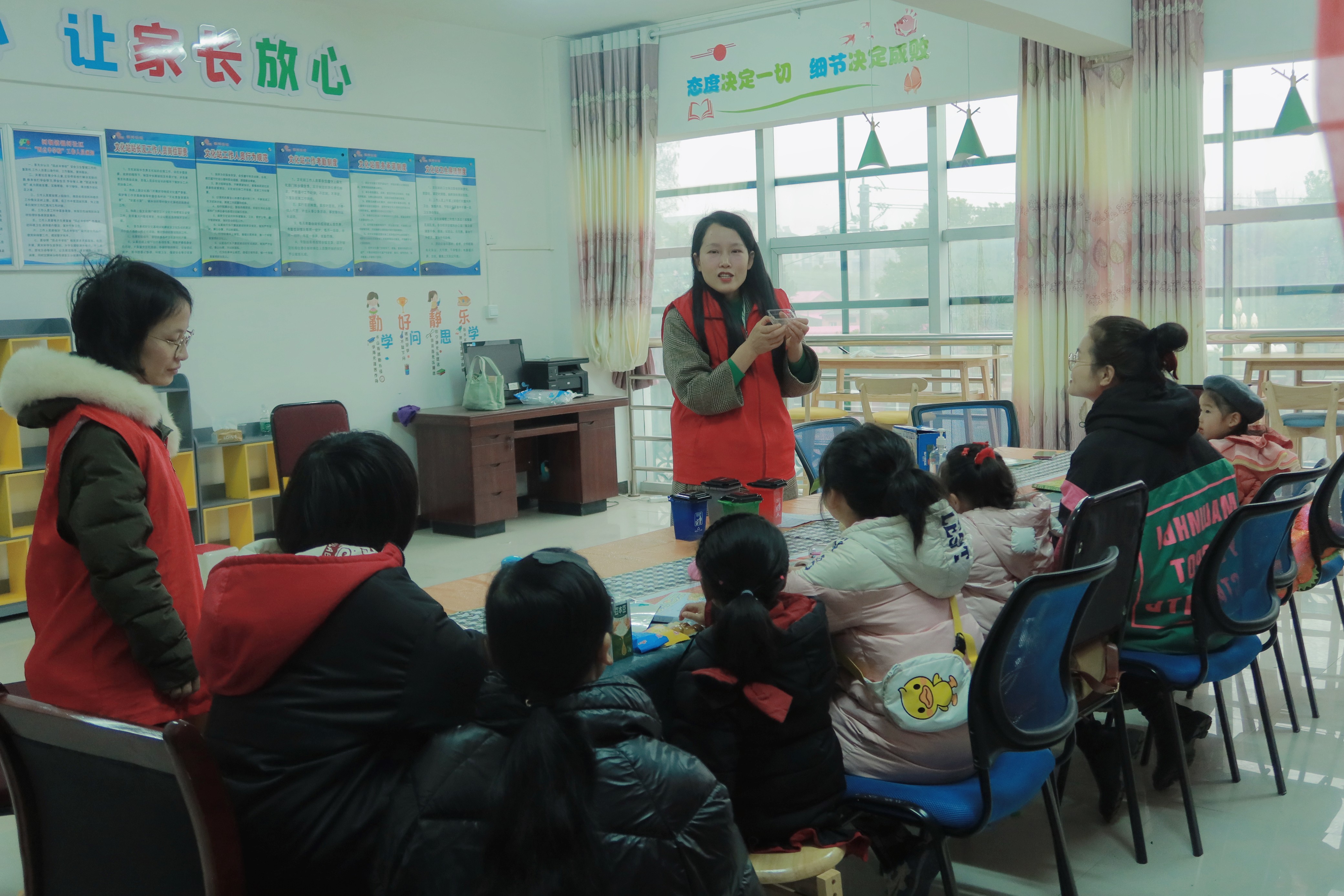 志愿者徐艺红老师正在向孩子们介绍垃圾分类知识