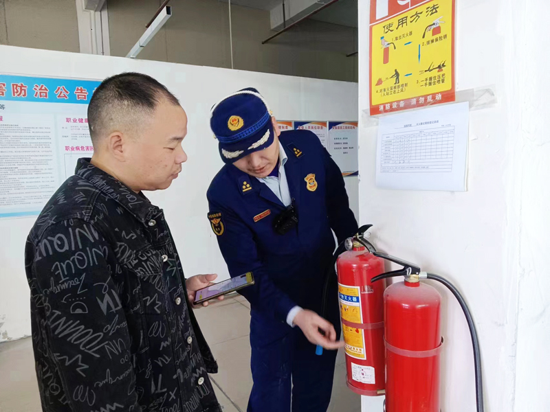 检查组消防队员检查尚雅新材料公司灭火器