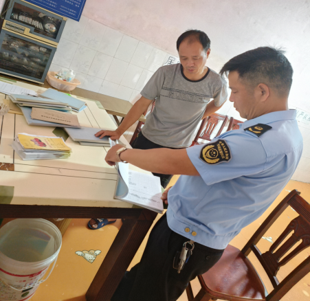 执法人员查看学校购进原材料台账等文件资料