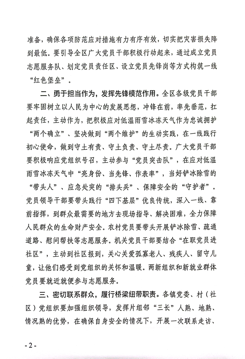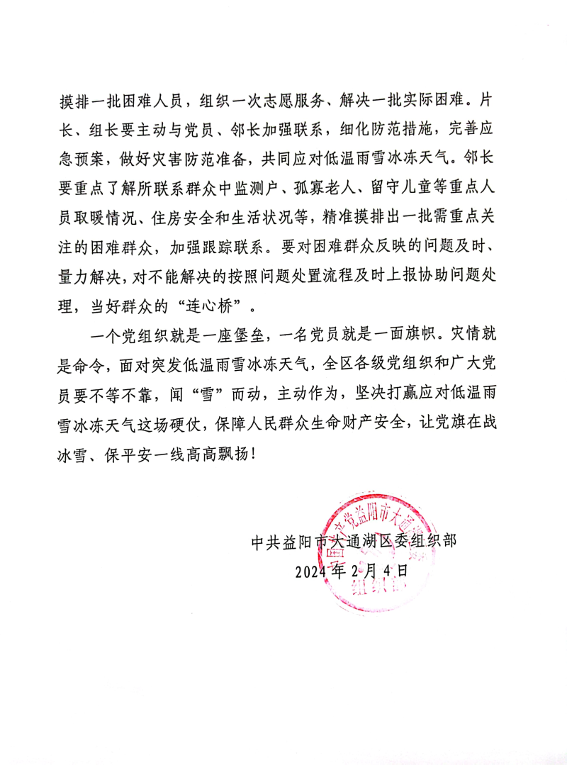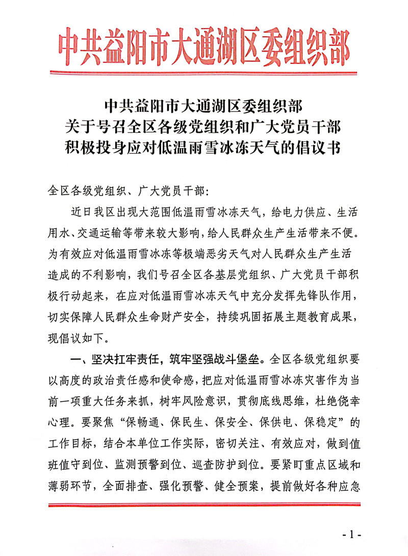 中共益阳市大通湖区委组织部关于号召全区各级党组织和广大党员干部积极投身应对低温雨雪冰冻天气的倡议书