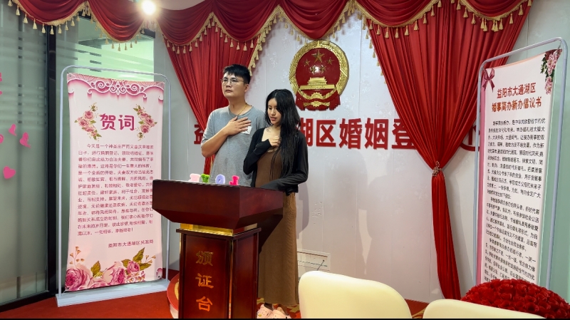 “希望两位新人在今后的生活中能践行婚姻誓词和倡议书内容,成为婚事简办新办的带头者和践行者,继承和发扬勤俭节约的优良传统。”5月20日,在大通湖区政务服务大厅,婚姻登记颁证处婚姻登记工作人员对前来办理婚姻登记的新人宣传。
