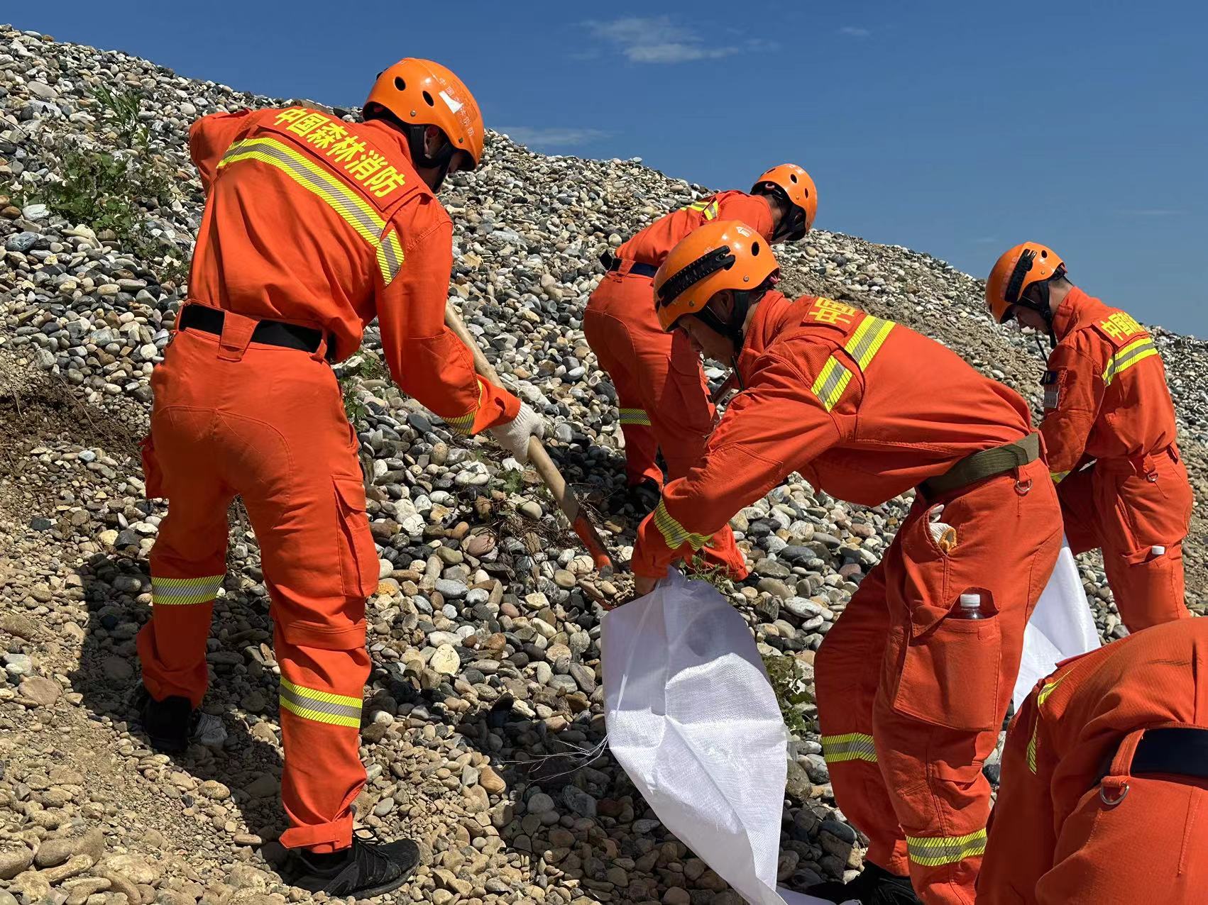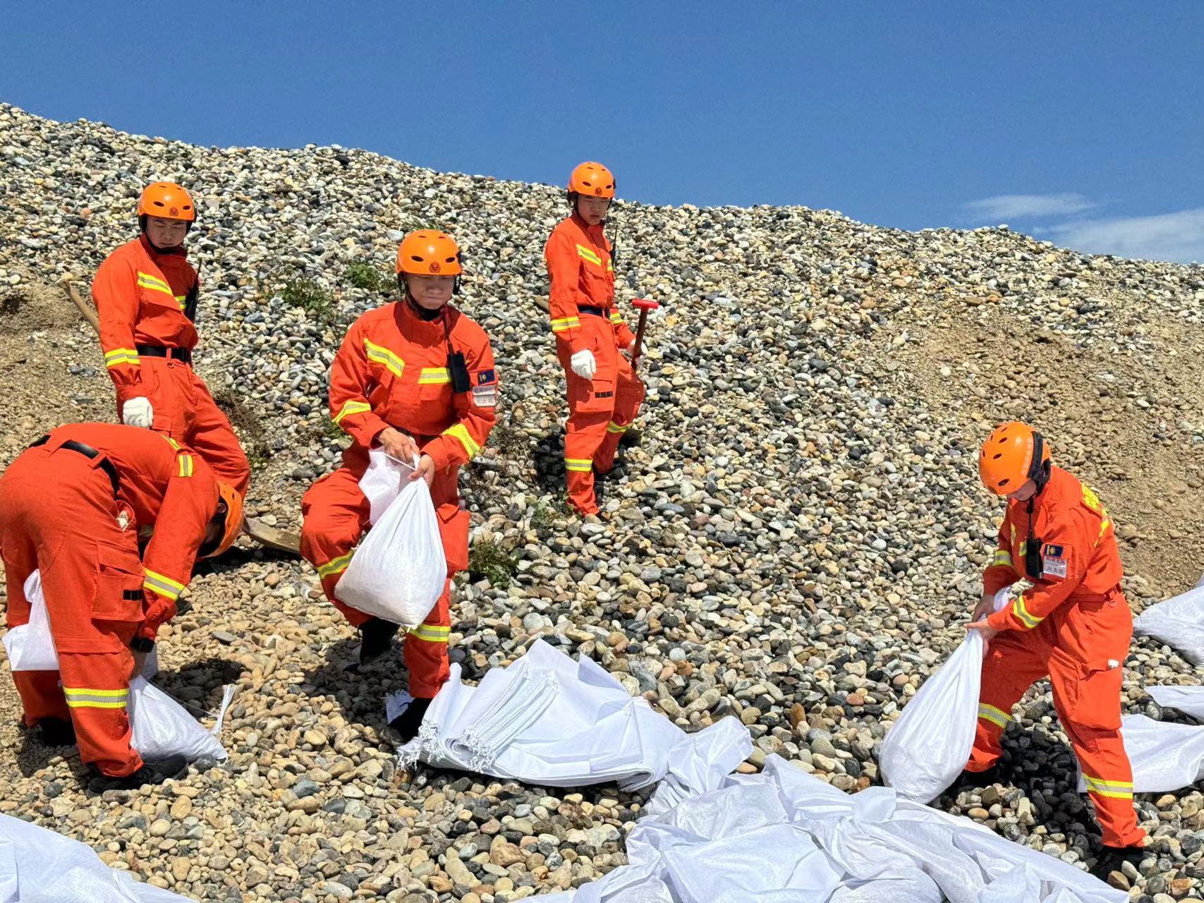 (消防指战员们正在装填砂卵石)