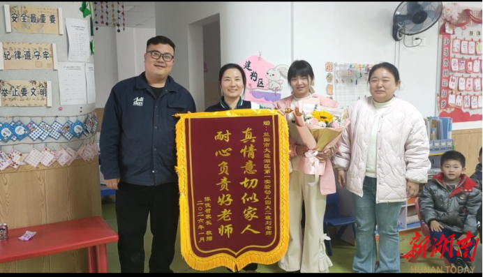 一面锦旗,一份重托;一场险情,一份担当。近日,大通湖区第一实验幼儿园大二班的欧老师和刘老师,收到了一份特殊的“冬日温暖”——俊哲小朋友的家长亲手送上印有“真情意切似家人,耐心负责好老师”的锦旗,用最真挚的方式,感谢老师们在危急时刻的沉着守护。