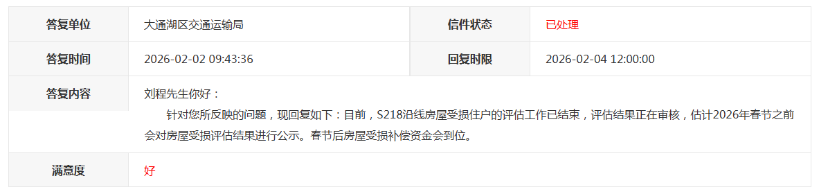 大通湖区交通运输局将于本周公布S218沿线房屋损坏的评估结果,并按照评估结果与房屋损坏的住户签订赔偿协议,再按照赔偿协议予以房屋损坏的相关赔付。